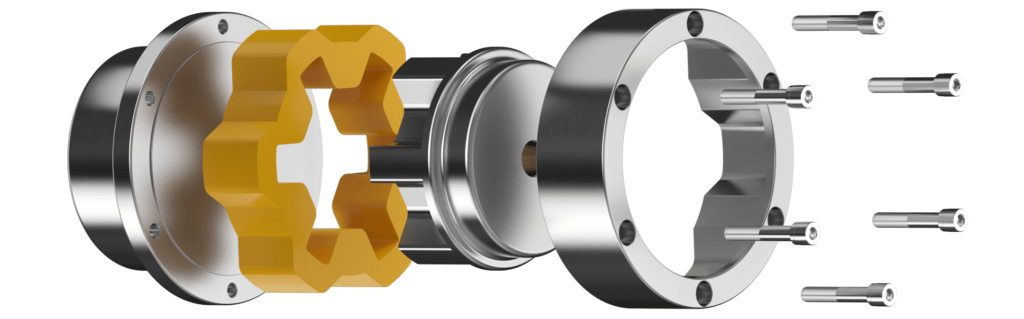 De T-serie koppelingen bestaan uit vier onderdelen: de ringnaaf, de flexibele naaf, de insert en de aandrijfring. De ringnaaf en de flexibele naaf worden op de assen gemonteerd, waarbij de aandrijfring over de flexibele naaf past. Na het uitlijnen van de koppeling wordt de insert rond de flexibele naaf geplaatst, die in de onderste nokken van de insert grijpt. De aandrijfring wordt vervolgens over de insert geplaatst, die in de bovenste nokken van de insert grijpt. De aandrijfring wordt vervolgens aan de ringnaaf bevestigd met behulp van inbusbouten van hoogwaardig gelegeerd staal. De koppeling brengt nu koppel over met een stille, soepele, betrouwbare en onderhoudsvrije werking.